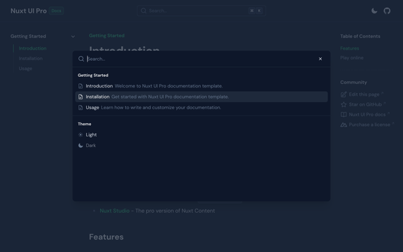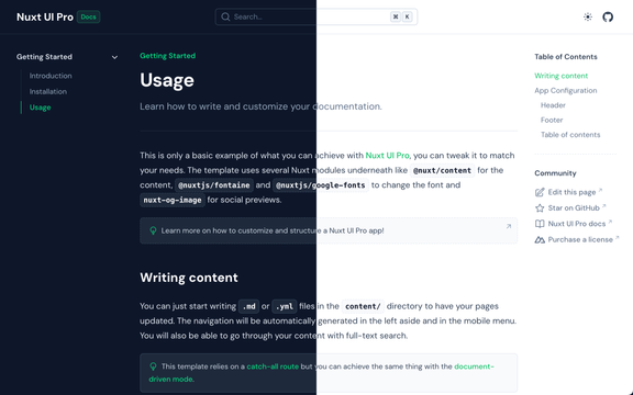 A ready-to-use documentation template integrated with Nuxt Studio. You can start writing your docs right away inside the content/